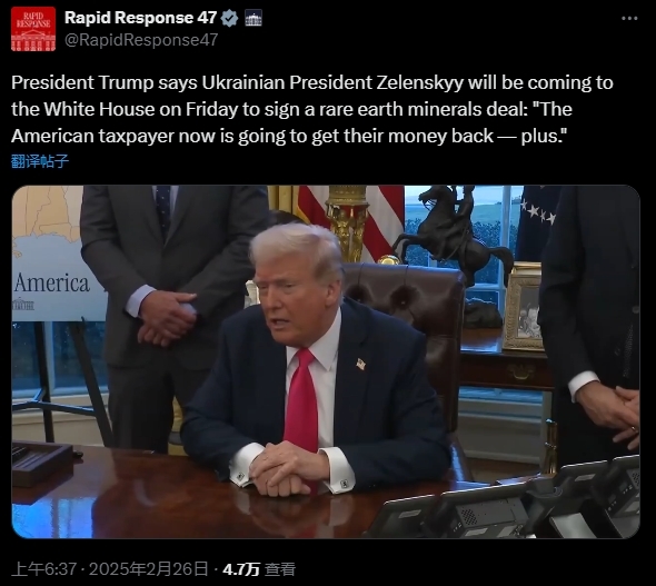 【文/不雅察者网 都倩】当地时辰2月25日,好意思国总统特朗普在白宫向记者暗意,乌克兰总统泽连斯基将于当地时辰周五(28日)前去白宫签署稀土矿产契约。据好意思国有线电视新闻网(CNN)和《乌克兰零丁报》音尘,泽连斯基办公室同日阐发,过程一段时辰的垂危接洽,好意思乌两边还是就乌克兰矿产达成契约。