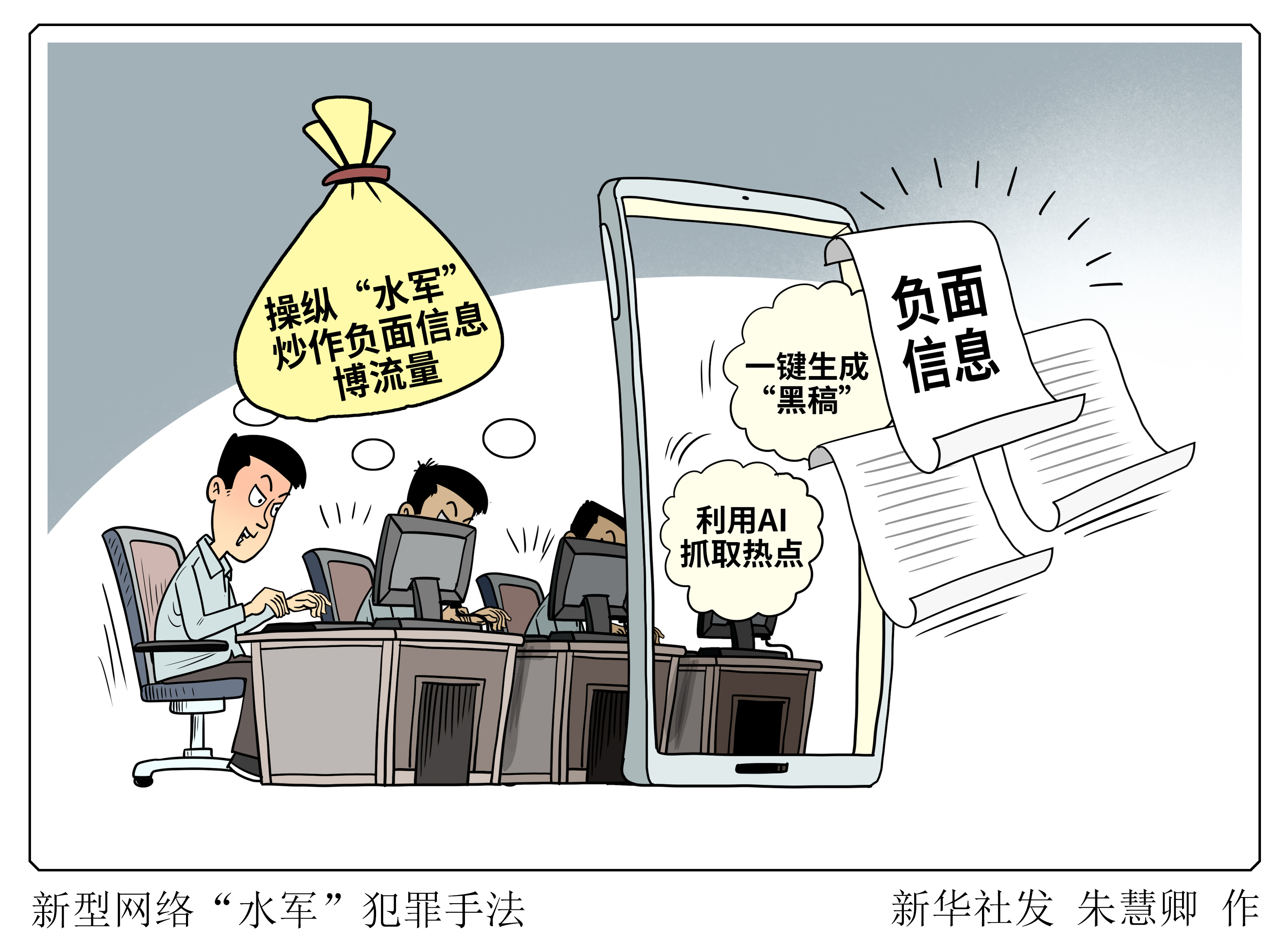 哄骗AI合手取热门,一键生成“黑稿”……连年来,辘集“水军”犯法呈现新动向,一些行恶分子哄骗辘集平台的算法逻辑,使用AI等时间成心炮制负面信息,操控海量“水军”账号同步炒作,借流量谋利。