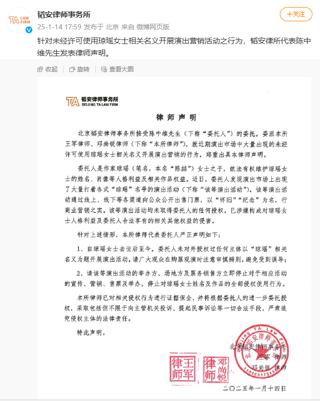 1月14日,琼瑶女儿陈中维拜托讼师发布声明在线网址,称近期献技市集出现多量未经许可使用琼瑶有关格局开展的献技,均未取得任何授权。声明条目当作举办方等立即住手当作宣传、营销、售票及举办,“住手对琼瑶女士姓名及作品的沿途侵权使用行径”。